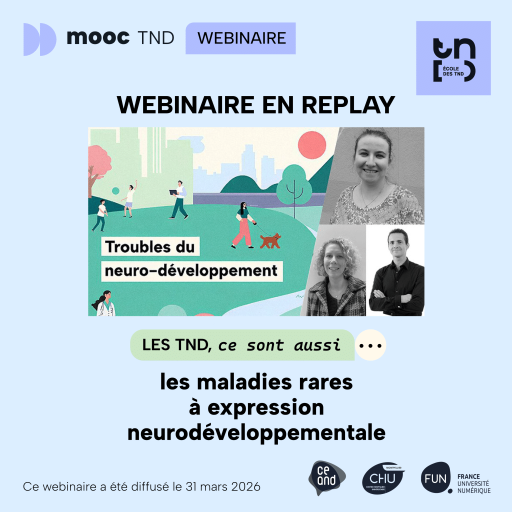 🗓️ Ce webinaire s’inscrit dans la série « Les TND, ce sont aussi… », qui explore différentes thématiques associées aux troubles du neuro-développement dans le cadre du MOOC TND, une formation de 14h, 100% gratuite.